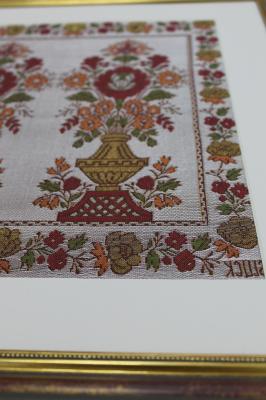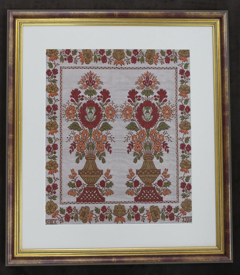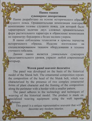 Панно разработано на основе исторического образца слуцкого пояса. Орнаментальная композиция повторяет композицию головы слуцкого пояса, для которой было характерным наличие двух сложных орнаментальных форм растительного характера и обрамление композиции по периметру бордюром с более мелким узором. В панно соблюдены технология и приемы ткачества исторического образца. Изделие изготовлено на специализированном ткацком оборудовании в технике уточного гобелена. Данное панно является уникальным сувениром представительского уровня, украсит любой современный интерьер. Арт: 21с-290-224/570-20. Размер в готовом виде: 32х38 см. Состав: 63% шёлк натуральный; 9% нить металлик; 28% п/э.   Изготовитель: Слуцк "Слуцкие пояса"